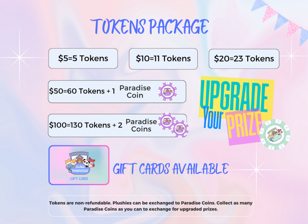 At Claw Paradise, fun starts with our tokens — just $1 per token.