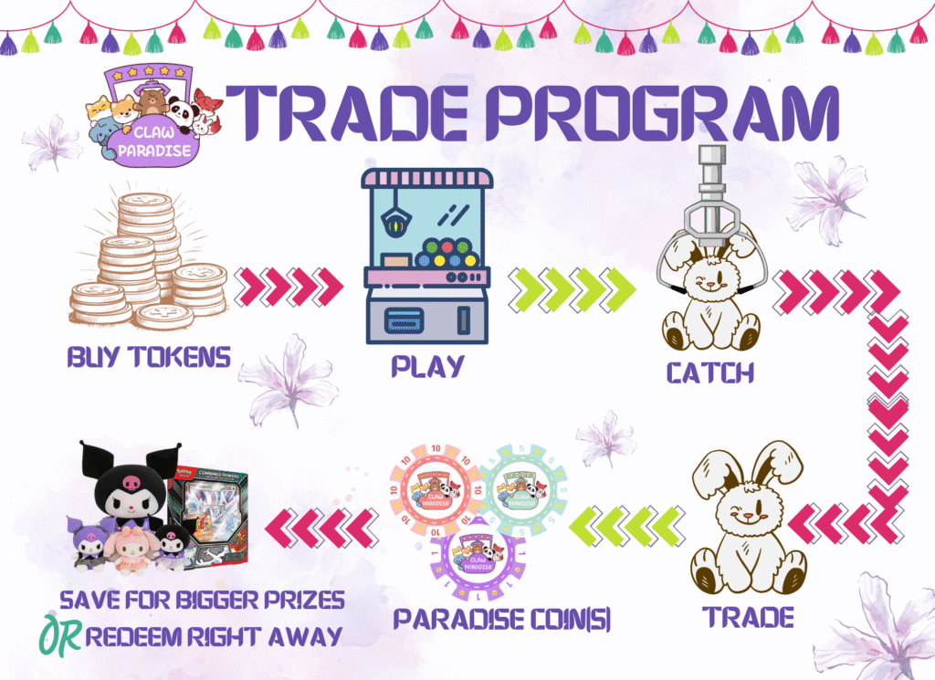 At Claw Paradise, every plush you win is worth 1 Paradise Point through our Trade Program! You can collect points and use them anytime toward your next favorite prize.